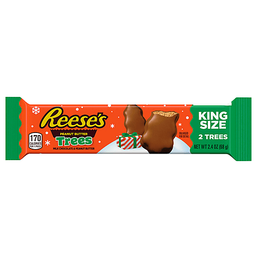 The holidays just got a lot sweeter with REESE'S Milk Chocolate King Size Peanut Butter Trees candy. Whether you're filling Christmas candy dishes or stuffing a line of festive stockings, there's never been a better season to get lost in the taste of smooth peanut butter and rich milk chocolate of a REESE'S candy. 'Tis a time for spreading joy, and each tree shaped chocolate sweet in this pack provides a perfect helping of festive fun to treat the taste buds of your favorite candy lover on Christmas. Light in weight but heavy on flavor, these candy trees are sure to please anyone in need of a chocolate pick-me-up. Remember to treat yourself too. Keep some REESE'S peanut butter trees candies on hand for your next Christmas movie marathon. And don't stop there! If you're feeling creative this holiday season, include REESE'S milk chocolate peanut butter treats in your baking plans. Try putting whole or crumbled chocolate peanut butter candy on top of your best cookies, cupcakes or brownies — anyone you share with will beg for your secret recipe after just one bite. Just don't forget to save a few peanut butter Christmas candies for yourself during all of that sharing!